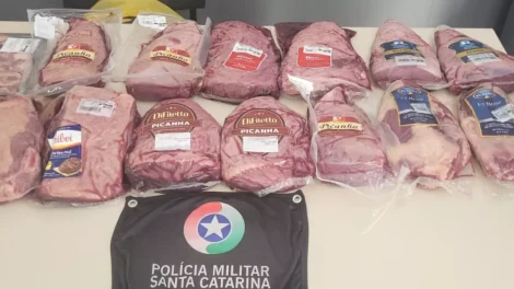 Com os dois homens, a polícia encontrou 13 peças de carne, incluindo várias picanhas Dois homens, suspeitos de furtar carnes em supermercados da...