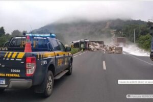 Um caminhão carregado com inseticida tombou na BR-376, em trecho de Tibagi, no Paraná. O acidente ocorreu neste sábado e causou interdição parcial da via...
