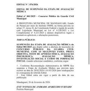 Ministério recomenda a suspensão da etapa avaliação médica do concurso da Guarda Municipal de Mandaguariu
