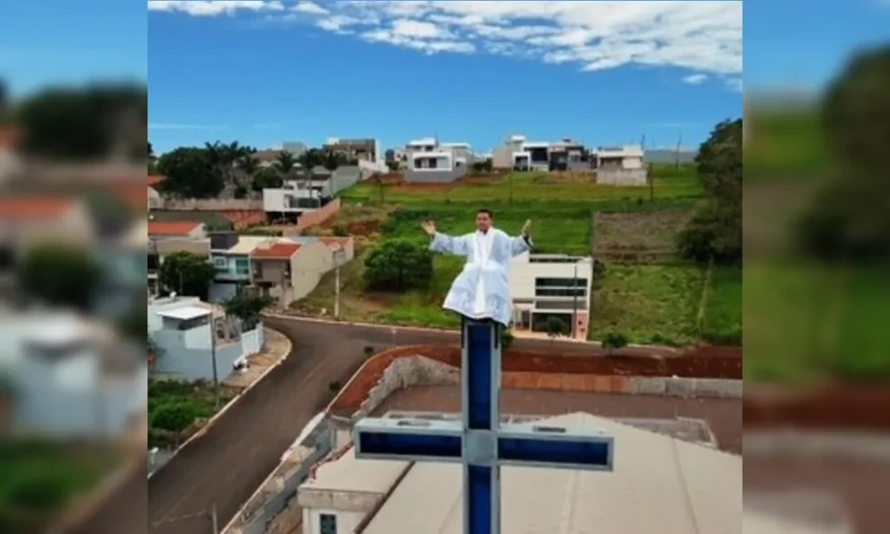 Para atrair os fiéis de uma maneira inusitada, o padre Laércio José Lara subiu pela segunda vez na cruz da Igreja de Santo Expedito, a 26 metros de altura, em Apucarana (PR). O objetivo da escalada, registrada por drones em meio aos ventos, foi gravar um vídeo para convidar a comunidade para a novena e para a 19ª Festa do padroeiro. Apesar da altura, o religioso relatou tranquilidade graças ao uso de cinto de segurança e ao apoio de auxiliares. “Não vou dizer que não dá um pouco de medo, mas eu estava extremamente seguro. A preocupação maior era acomodar a imagem dos drones e o texto ao mesmo tempo com a ventania, mas tudo ocorreu de modo bonito e deu certo”, detalhou o sacerdote.